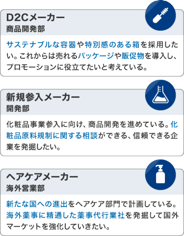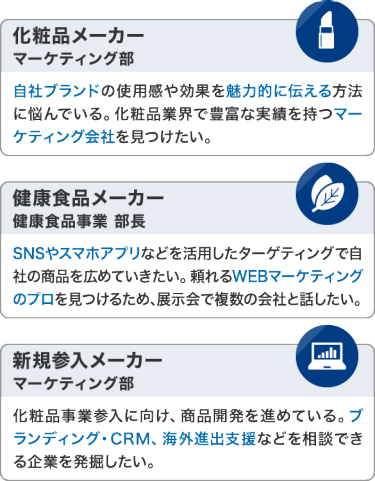 化粧品業界への参入が目立つ小売業やサービス業など異業種参入企業・新興メーカーのリード獲得もできます。