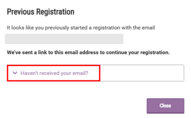 A. Please re-enter your email address on the registration page and wait for the pop-up to appear. Once it does, click "Haven't received your email?“