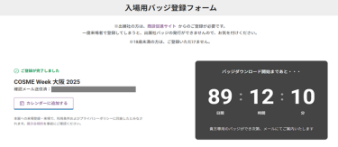 ご登録後に届く「COSME Week 大阪 2025 の来場登録が完了しました」というタイトルのメールを保管いただき 、メール本文にある”バッジをダウンロードする”をダウンロード可能日以降に押すとバッジが表示されるようになります。