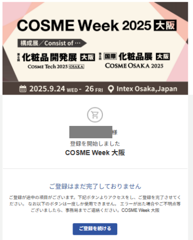 「COSME Week 大阪 2025 の登録を完了してください」というタイトルのメールが届いているかご確認いただき、”ご登録を続ける”をクリックし途中からご入力ください