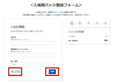 ※個人事業主等で会社名がない場合は、左下の「手入力する」をクリックし、「会社名」には「個人」と入力してご登録を続行ください。