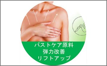 皮膚のハリと弾力の改善及び皮膚の水分保持量を増加に寄与し、バストのハリとふくらみを改善します。フラボノイドは血流促進効果によってアンチエイジング機能を発揮します。この3成分の相加効果によって、バストにハリと弾力を与えリフトアップさせます。