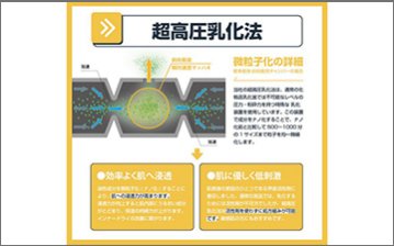 通常釜では不可能なほどの高圧をかけ、配合成分をナノ化させる処方です。特徴といたしましては、2点ございます。・界面活性剤不使用なので、低刺激な処方です。・浸透力が高く、肌馴染みがよくなります。