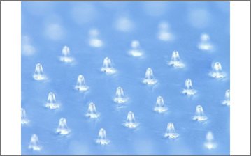 独自に開発したDEN製法の「溶解性マイクロニードル」は、安全に体内への有効成分の伝達が可能な製剤です。ヒアルロン酸やビタミンCなどの成分そのものを痛みを伴わずに直接、皮膚の内側に届けることが可能で、このような特徴から「痛みのない注射」と呼ばれています。