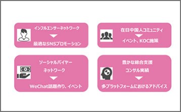 中国のSNSマーケティングが中心に、イベント運営や越境EC、ライブコマスサポートも行っております。自社独占インフルエンサー、ソーシャルバイヤーネットワークを活かした提案をはじめ総合的なサポートが可能です。現地に合うような戦い方ができるのは弊社の強味です。